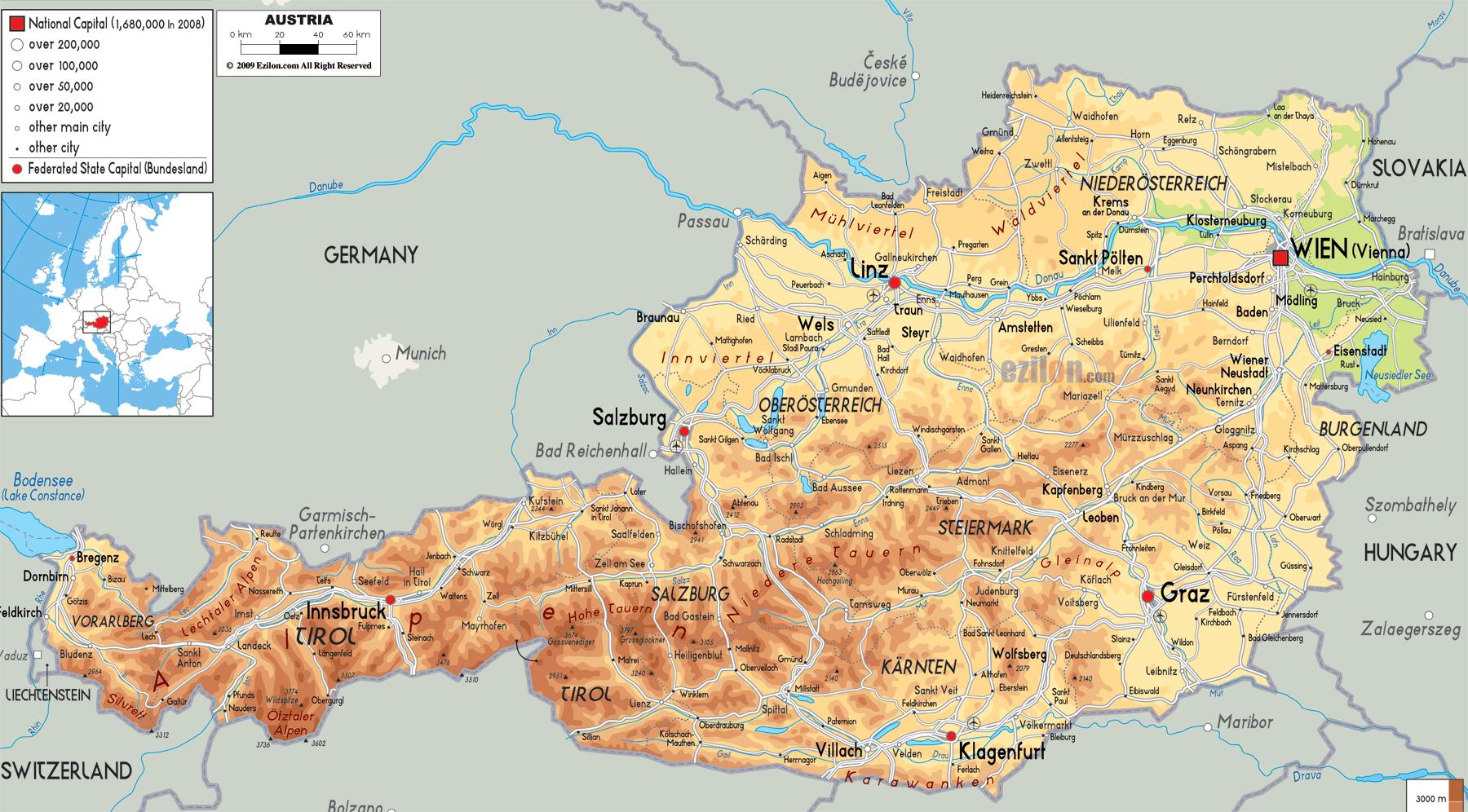 Austria mountains map. Austrian alps map (Western Europe - Europe) to print. Austrian alps map (Western Europe - Europe) to download.